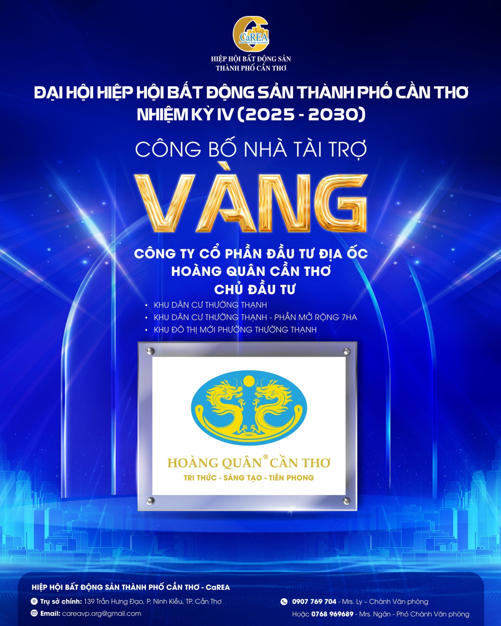 Việc đồng hành cùng Hiệp hội Bất động sản TP. Cần Thơ (CaREA) với vai trò Nhà tài trợ Vàng không chỉ thể hiện trách nhiệm xã hội, mà còn khẳng định uy tín, năng lực và tầm nhìn chiến lược của Hoàng Quân Cần Thơ trong lĩnh vực phát triển đô thị.